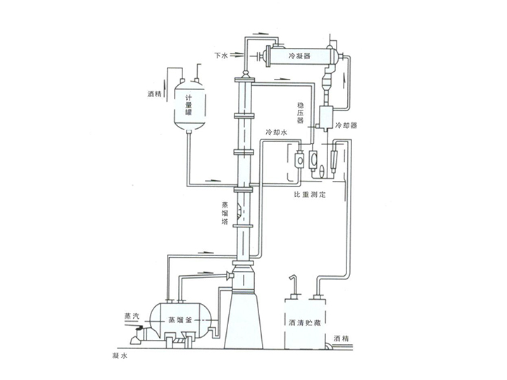 本裝置采用高效的金屬不銹鋼填料。蒸餾塔采用不銹鋼制,從面防止了鐵屑堵塔填料的現(xiàn)象,延長(zhǎng)了裝置的使用期限。本裝置中凡接觸酒精設(shè)備部分如冷凝器,溫壓罐,冷卻蛇管等均使用不銹鋼,以確保成品酒精不被污染。蒸溜釜采用可拆U型加熱管,在檢修時(shí)可將U型加熱管拉出釜外,便于對(duì)加熱外壁及蒸餾釜壁進(jìn)行清洗,本裝置可間歇生產(chǎn),也可半連續(xù)、連續(xù)生產(chǎn)。